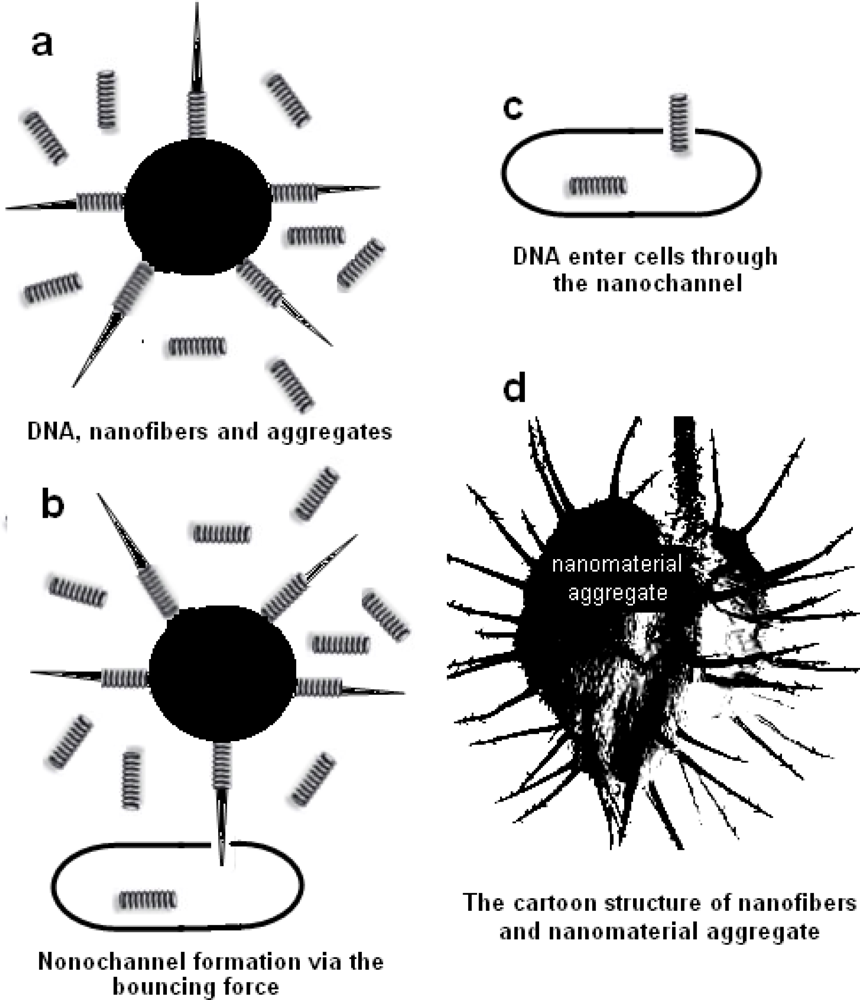 The hypothesis for the mechanism of plasmid transformation by means of nanomaterials. (a–c) The model for the process of heterogeneous DNA entering a cell with the help of nanomaterials; (d) the cartoon structure of nanofiber and nanomaterial aggregates.