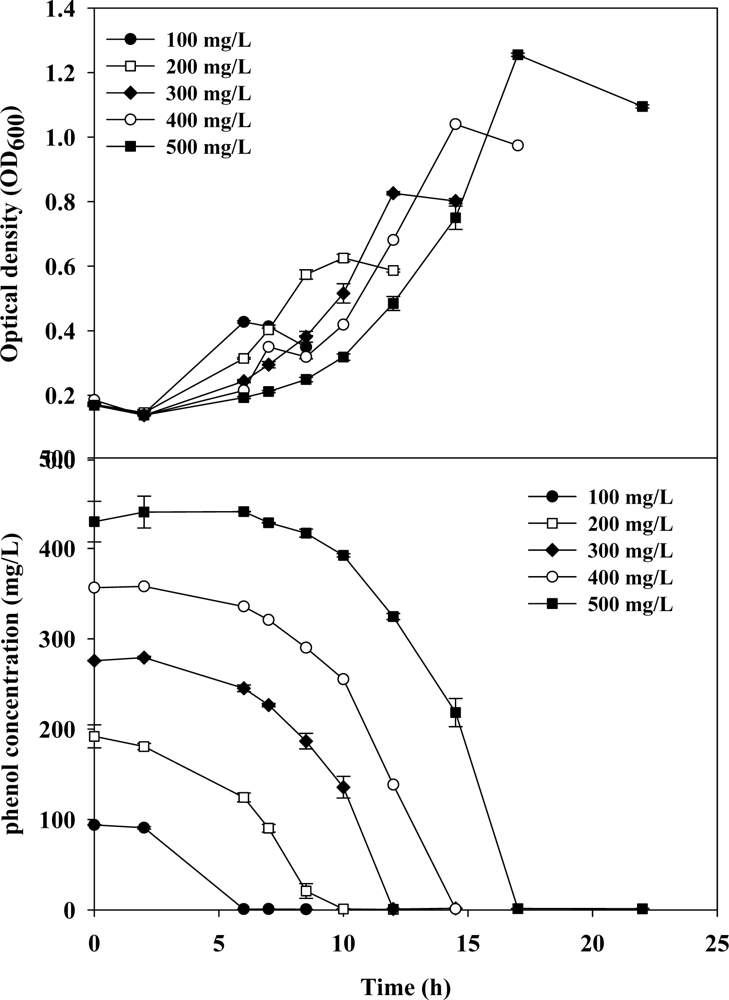 Batch culture and phenol degradation of C. taiwanesis 187 on phenol (100–500 mg/L) in flasks (n = 3).
