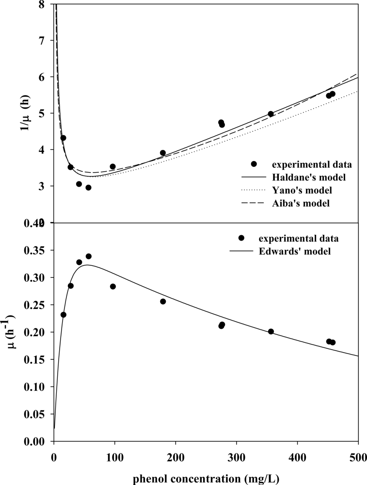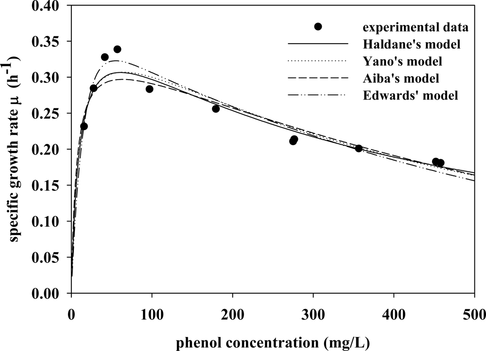 where μmax is the maximum growth rate (h−1), Ks is the substrate-affinity constant (mg/L), and KI is the substrate-inhibition constant (mg/L). Several modified models with two or more parameters have also been developed. Other models of enzyme kinetics or alcohol fermentation with inhibitory substrate(s) or product(s) may also be applicable for phenol degradation. Three alternatives (Table 1) were considered in this study.