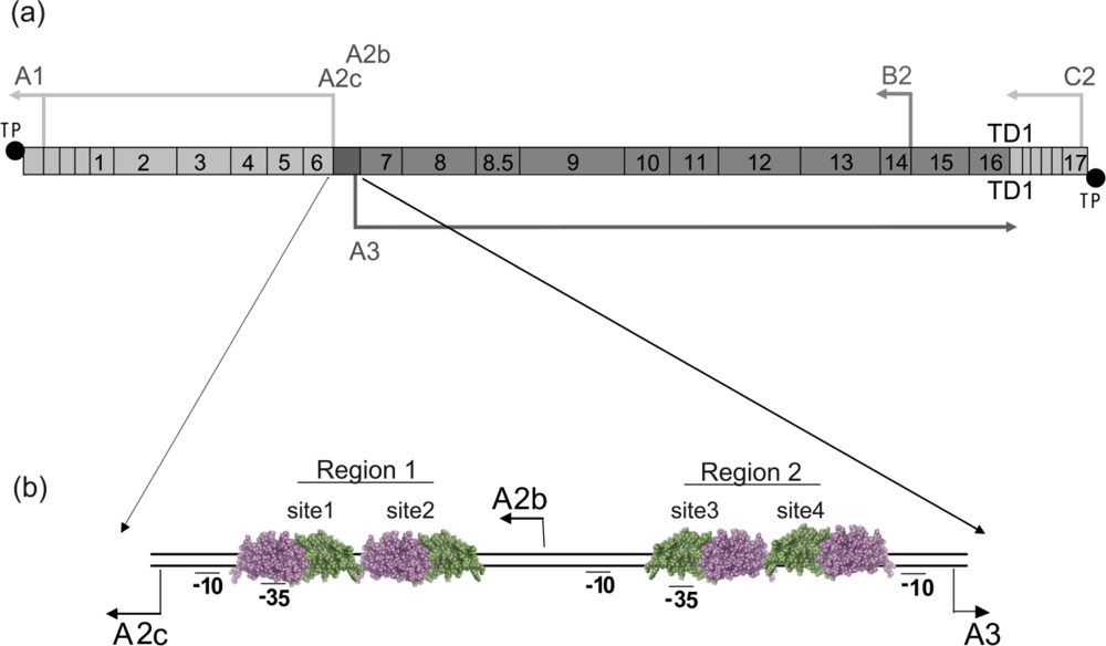 (a) Genetic and transcription map of phage Ø29. Genes are indicated by numbers from 1 to 17. Location of the promoters A1, A2c, A2b, A3, B2 and C2 are indicated, and the transcription terminator TD1 is denoted; (b) detail of the Ø29 genome intergenic region between early promoter A2c and late promoter A3. Protein p4 dimer is represented in violet-green. Protein p4 binding region 1 contains sites 1 and 2 and region 2 contains sites 3 and 4.