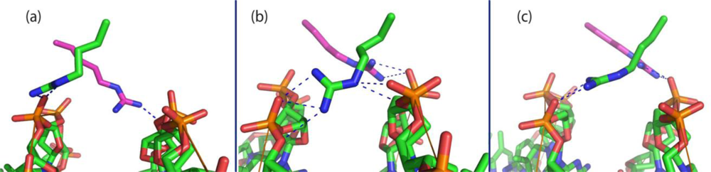 Selected images of Arg54 rearrangement at (a) 0 ns, (b) 2.4 ns and (c) 4 ns. Arginine54-monomer B (violet) interacts only with T + 2 phosphate along the trajectory. Arginine54-monomer A (green) interacts with G − 1 phosphate in (a); with G − 1 and T + 3 phosphates and with deoxyribose O3 atoms of A0 and T + 3 in (b) and with G − 1 phosphate in (c).
