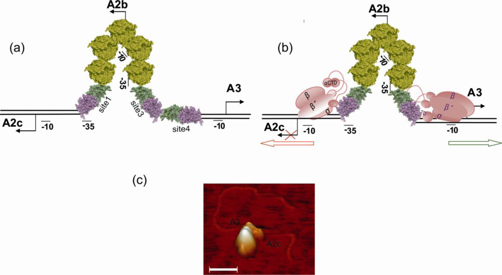 Model and Atomic Force Microscopy (AFM) images representing the hairpin on the p4-p6-DNA and on the p4-p6-RNAP-DNA complexes. (a) Localization of proteins and topology of the DNA on the ternary p4-p6-DNA complex. Protein p4 (dimer in violet-green) and protein p6 (dimer in yellow) binding between promoters A2c and A3 results in the formation of the nucleoprotein-hairpin. P4 bound to sites 1 and 3 partially overlay the −35 elements of early promoters A2b and A2c, respectively; (b) Model of the p4-p6-RNAP-DNA quaternary complex. The RNAP is represented stably bound to promoter A3 but in an unstable interaction with promoter A2c; (c) AFM image of a quaternary complex p4-p6-DNA-RNAP. The image shows the large volume of the RNA polymerase bound to promoter A3 and to its right the hairpin structure originated by the binding of p4 and p6 to the DNA.