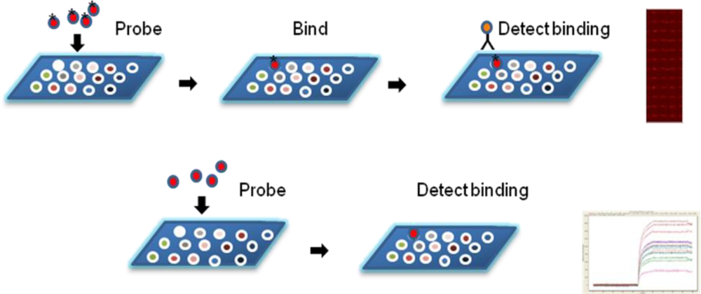Measuring probe interactions with microarrayed proteins. Top: Detecting binding events using a fluorescently-labeled secondary probe, such as an antibody, and the resulting laser-scanned image. Bottom: Label-free interactions detected by surface plasmon resonance, resulting in a sensorgram of binding kinetics.