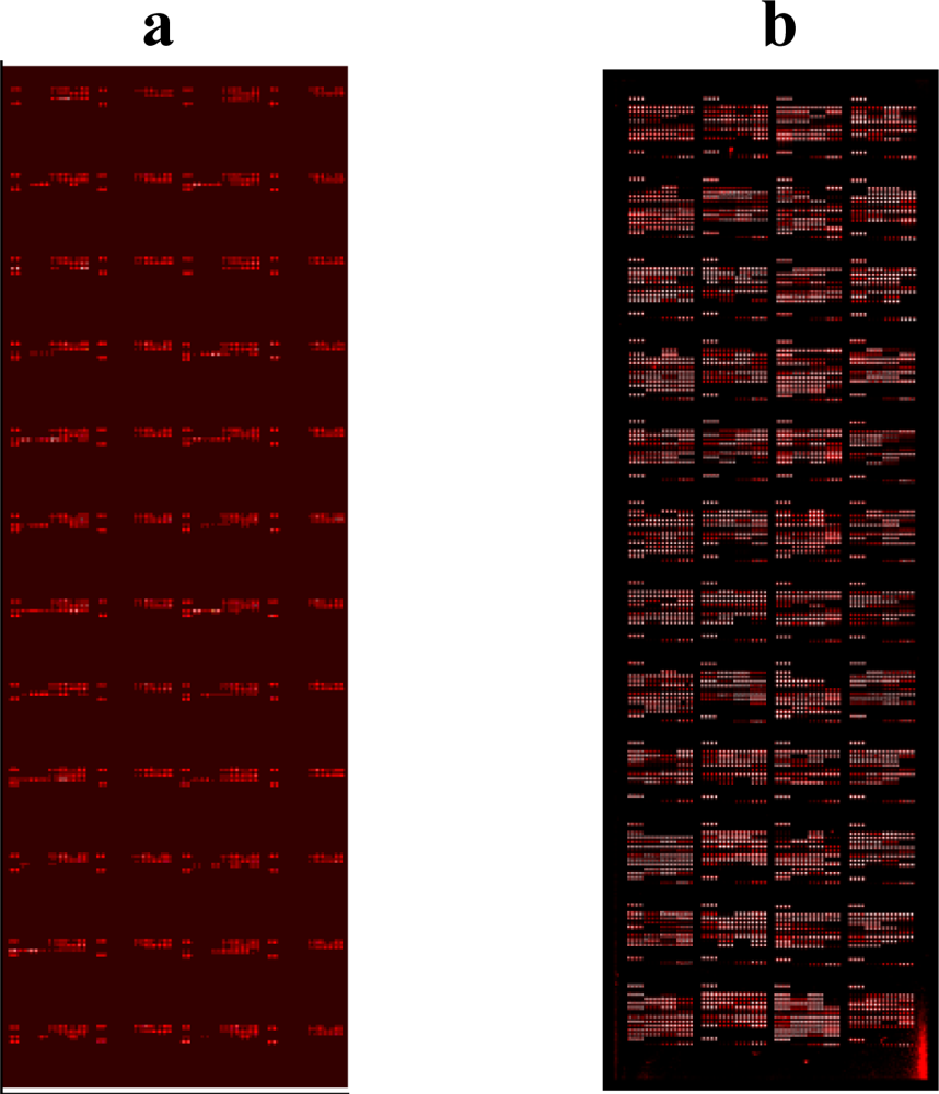 Pathogen proteome microarrays. Confocal laser scanner image of proteins spotted in duplicate onto microarray slides, visualized using a rabbit anti-GST antibody bound to Cy5-labeled anti-rabbit antibody. (a) Vaccinia virus; (b) Yersinia pestis.