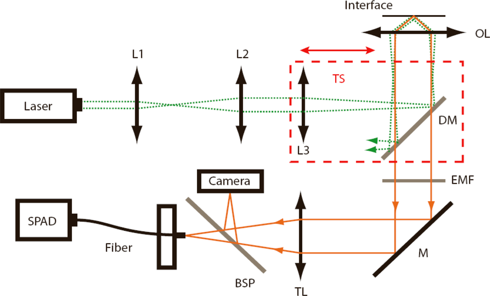Schematic of the objective-based TIR-FCS setup. L1–L3: lenses; TS: translator; DM: dichroic mirror; OL: objective lens; EMF: emission filter; M: mirror; TL: tube lens; BSP: beamsplitter plate; SPAD: single photon avalanche diode.