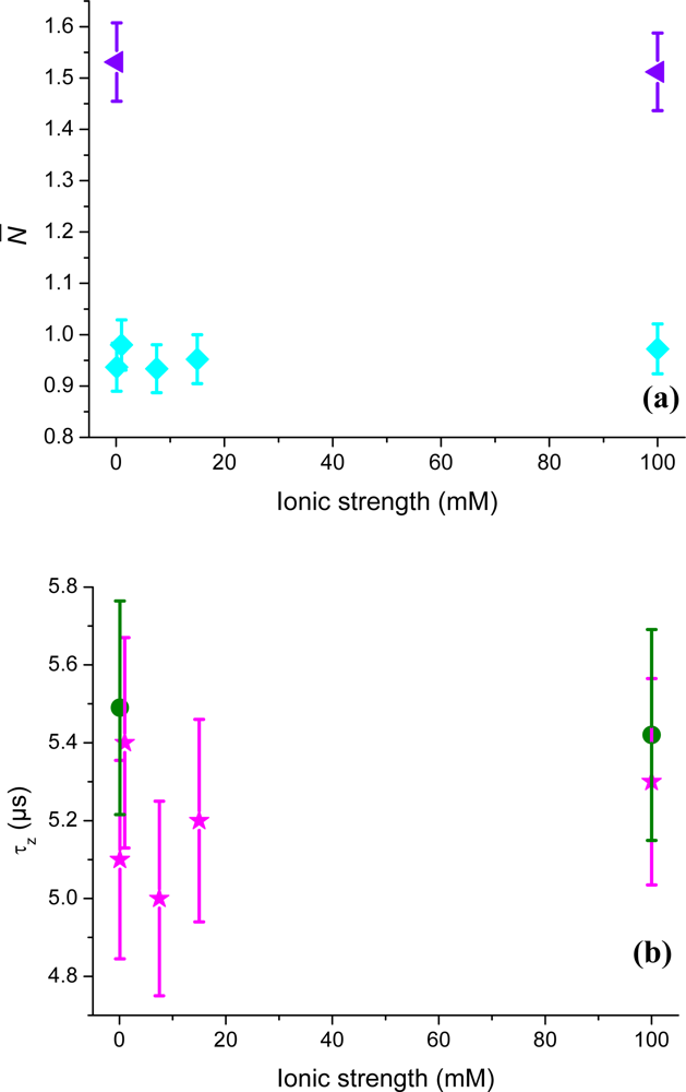 (a) The number of rhodamine 110 (purple triangles) and ATTO 488 (cyan squares) molecules, N̄, in the TIR-FCS probe volume, as a function of ionic strength. The sample concentration of rhodamine 110 and ATTO 488 were 50 nM and 40 nM, respectively. (b) The axial passage-time, τz, of rhodamine 110 (green hexagons) and ATTO 488 (pink stars).