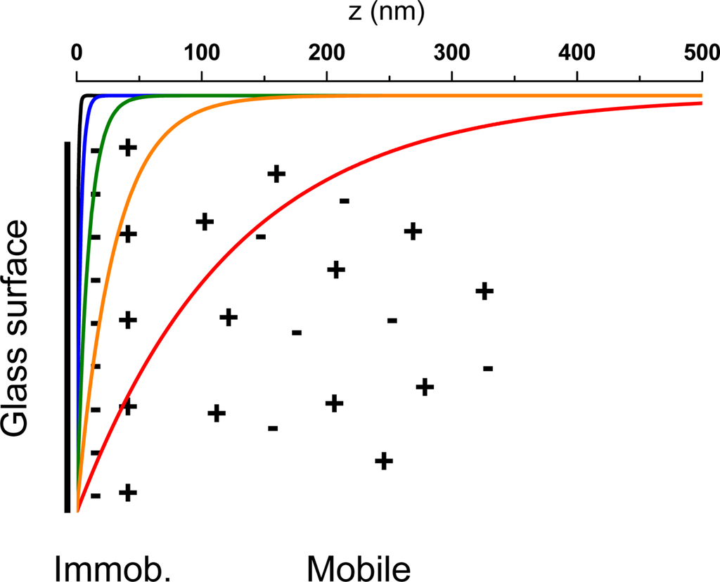 When a solid material is in contact with an aqueous solution, a thin interfacial charge layer is formed, which consist of surface charges and charge balancing counterions [38]. The presence of the surface charges causes a rearrangement of the ions in the vicinity of the surface. This arrangement of a nonzero net charge at the solid-liquid interface is usually dubbed the electric double layer. In the electric double layer, two regions of charge distributions may be identified. Immediately next to the charged surface, counterions are bound to the surface due to strong electrostatic attraction. Outside of this immobile layer counterions may move, meaning that they can diffuse in the potential set up by the partially screened surface. The immobile region is often referred to as the compact layer or the Stern layer, and the mobile region is dubbed the diffusive layer. The electrostatic potential at the boundary dividing the compact layer and the diffusive layer is the so-called zeta (ζ) potential [6]. A schematic model of the electric double layer on a glass surface is shown in Figure 2. On uncoated glass surface, acidic silanol groups acquire a negative charge (SiO−) at neutral pH. This negative surface charge density is balanced by counterions attracted to the surface and diffusive ions counterbalancing the potential set up by the partially screened surface. On uncoated hydrophilic surfaces such as glass, the surface potential has been shown to be indistinguishable from the zeta potential [13].