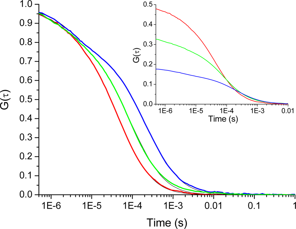 Autocorrelation curves for the cationic rhodamine 123 at ionic strengths of 100 mM (red curve), 10 mM (green curve) and 0.1 mM (blue curve). The correlation curves are fitted with Equation (4) to estimate the unknown parameters N̄,τz, T̄, and τ̄t. To visualize the effect of the electrostatic interactions on the diffusion time, the curves have been normalized. The inset shows the unnormalized curves, which are used to visualize changes in concentration of molecules in the vicinity of the glass interface. At ionic strength of 100 mM: N̄ = 0.62, τz = 4.9 μs, T̄ = 0.057 and τ̄t = 1.6 μs; at 10 mM: N̄ = 0.96, τz = 9.7 μs, T̄ = 0.1 and τ̄t = 2.1 μs; at 0.1 mM: N̄ = 1.93, τz = 23.5 μs, T̄ = 0.17 and τ̄t = 3.1 μs. Concentration of Rh123 was 20 nM.