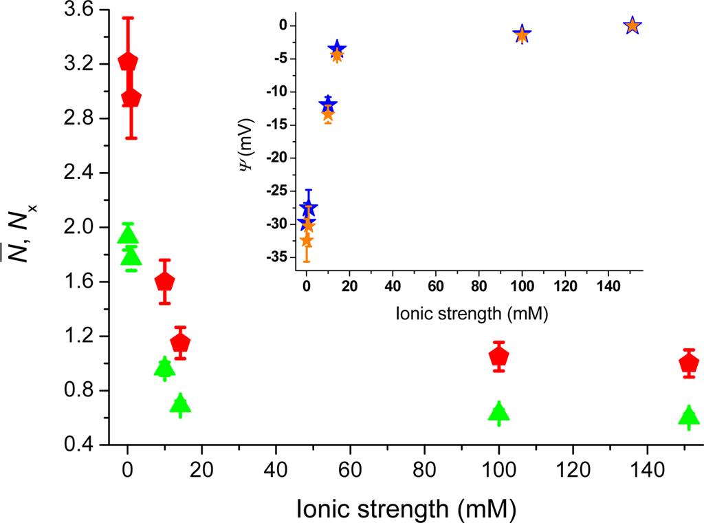 Mean number of rhodamine 123 molecules in the TIR-FCS probe volume, N̄ (red pentagon), and the ratio of molecules, Nx (green triangles), as a function of ionic strength. The inset shows the deduced mean surface potential of the electric double layer without (blue stars) and with (orange stars) correction for background contributions. Data points at 14 mM and 150 mM is done in PBS at pH = 7.2. Data points at 0.1 mM, 1 mM, 10 mM, and 100 mM are done at pH = 6.6.