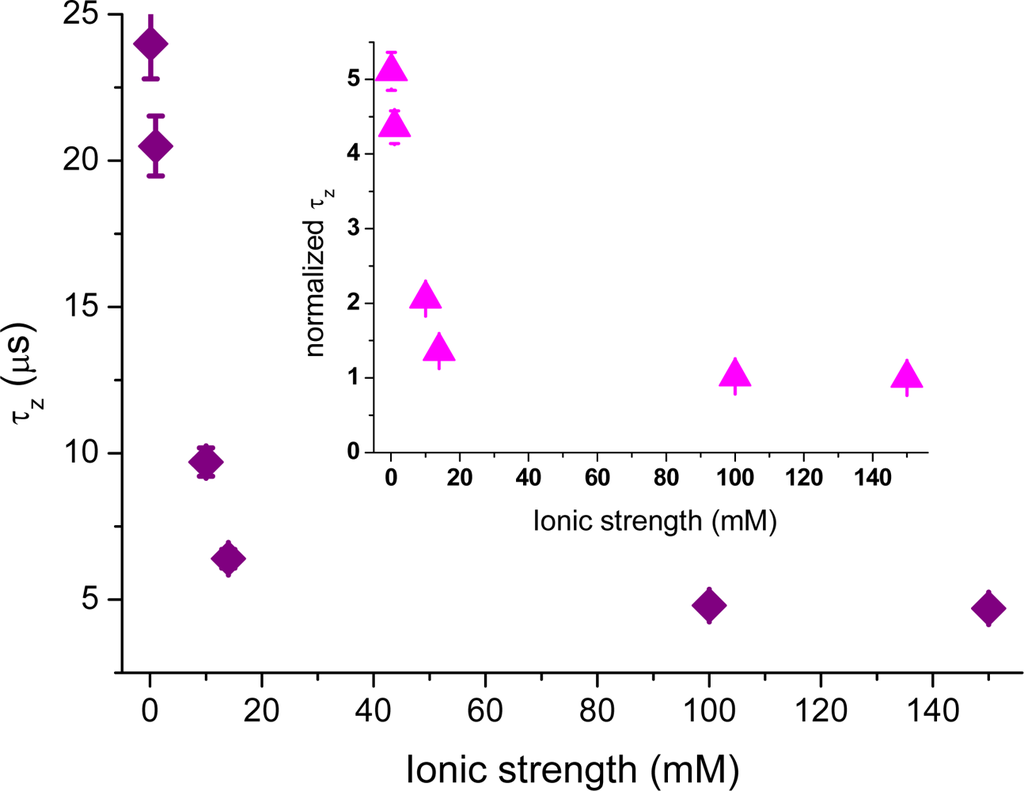 The axial passage-time, τz, for rhodamine 123, as function of ionic strength (purple squares), deduced by fitting the autocorrelation data with Equation (2). The inset shows the normalized axial passage-time (pink triangles).
