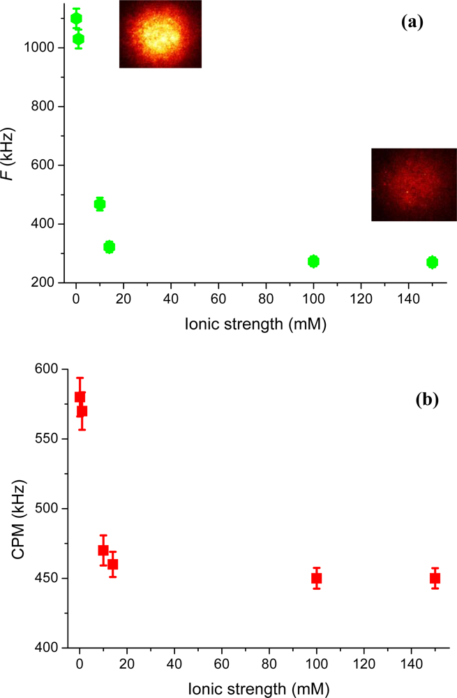 (a) The SPAD detected fluorescence, F, as function of ionic strength (green hexagons). The inset shows the detected CCD intensities at 0.1 mM (left) and 150 mM (right) ionic strength. The camera images are presented with the same peak intensity setting and the diameter correspond to 20 μm in sample space. (b) The counts-rate-per-molecule, CPM, as a function of ionic strength (red squares).