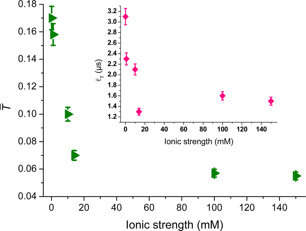 The triplet amplitude, T̄, describing the probability of the rhodamine 123 molecules to be in the triplet state, as function of ionic strength (green triangles). The inset shows the triplet relaxation time, τ̄T (pink squares).
