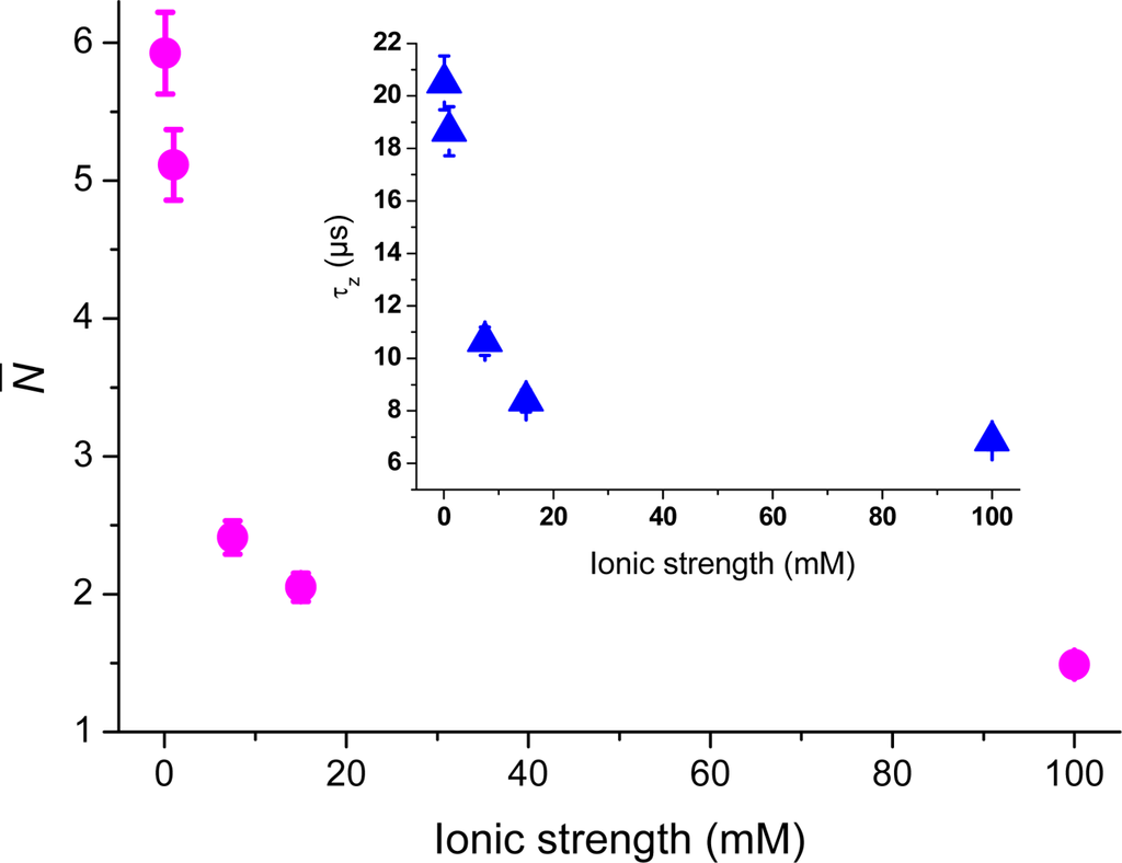 The number of rhodamine 6G molecules, N̄ (pink circles) in the TIR-FCS probe volume, as a function of ionic strength. The sample concentration was 50 nM and the values have been corrected for background contributions. The inset shows the axial passage-time, τz (blue triangles).
