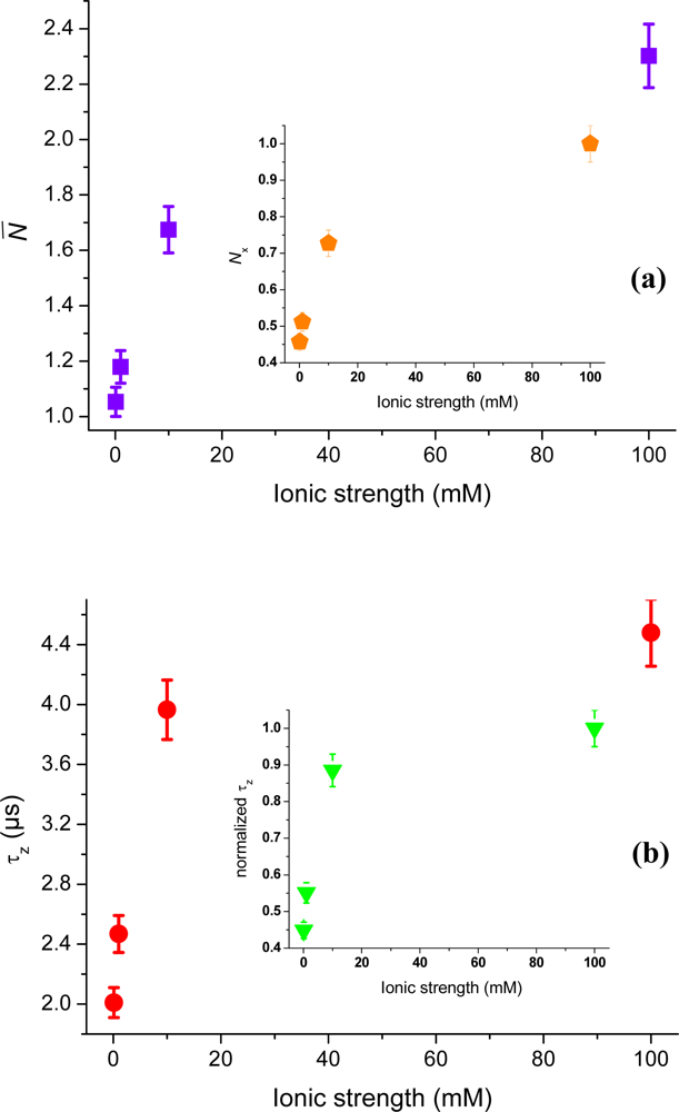 (a) The number of fluorescein molecules, N̄ (purple squares) in the TIR-FCS probe volume, as a function of ionic strength. The concentration variation ratio of molecules, Nx, is shown in the inset (orange pentagons). The sample concentration was 100 nM. (b) The axial passage-time, τz, for fluorescein as function of ionic strength (red circles). The inset shows the normalized axial passage-time (triangles).