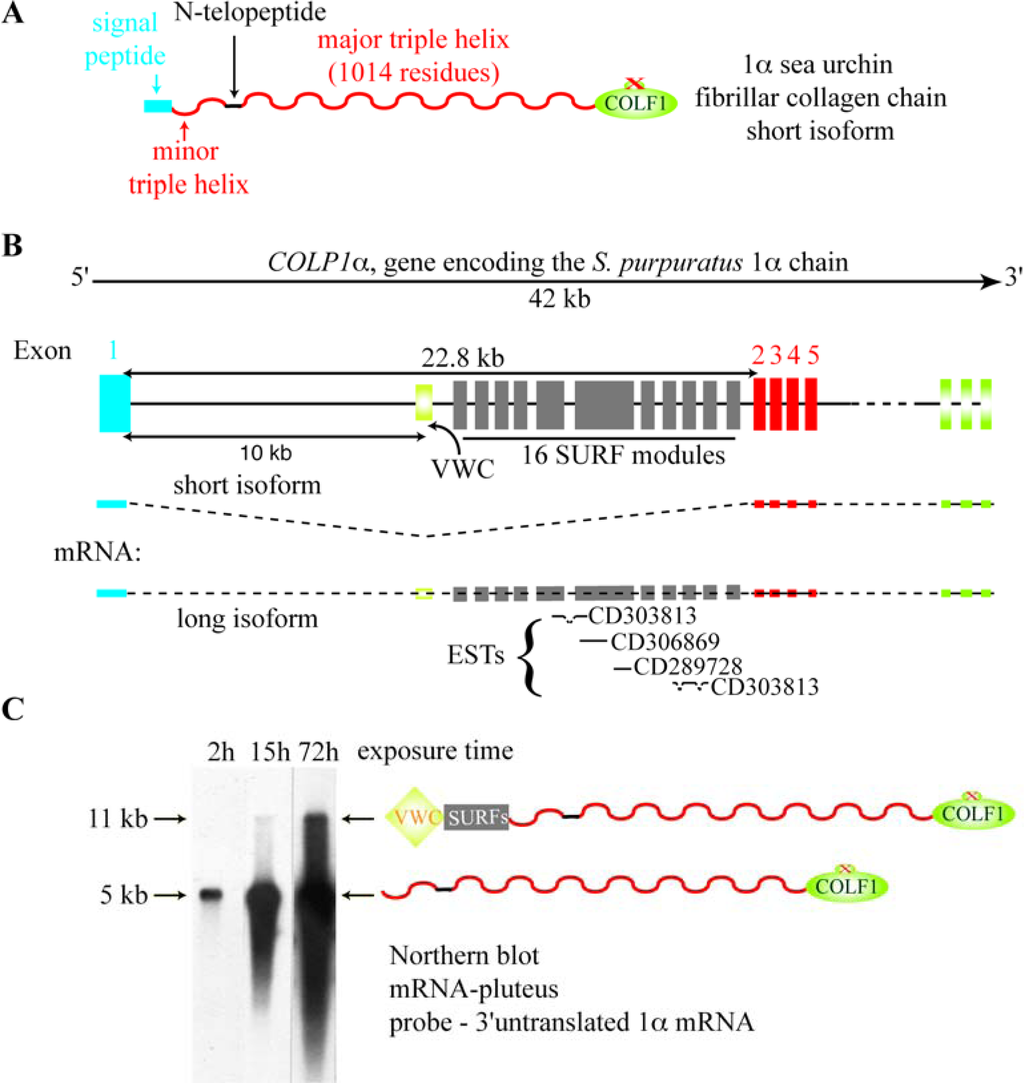 - Exposito, JY; D’Alessio, M; Solursh, M; Ramirez, F. Sea urchin collagen evolutionarily homologous to vertebrate pro-α2(I) collagen. J. Biol. Chem 1992, 267, 15559–15562. [Google Scholar]