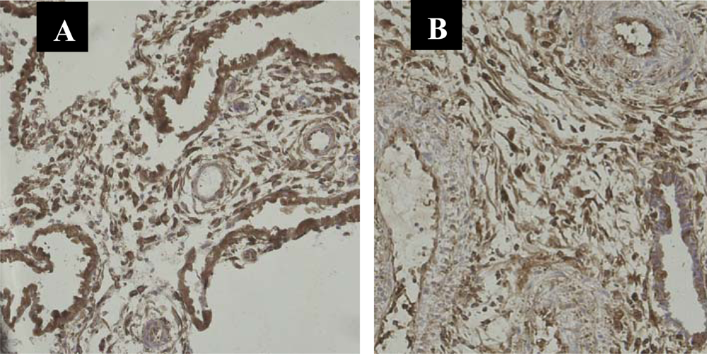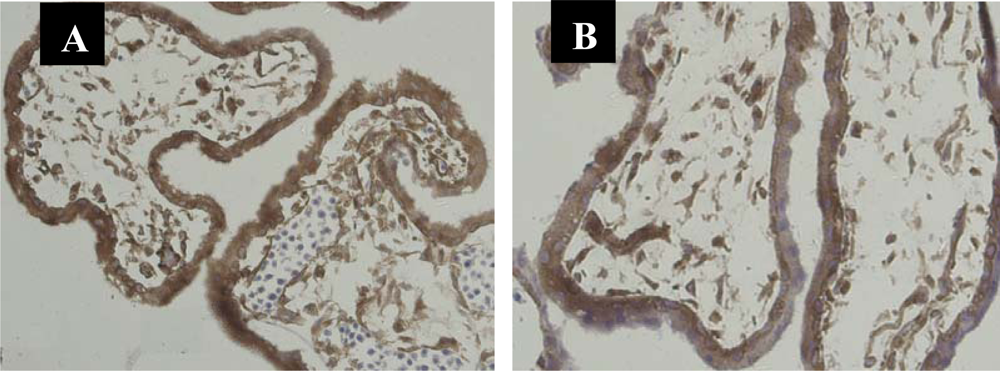 Significantly lower staining score with NF-κB in villous syncytiotrophoblasts in the SM group than in the control group by immunohistochemistry. (A), Control; (B), Early spontaneous miscarriage. SP × 200.
