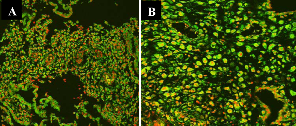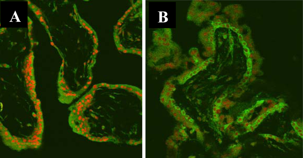 Immunofluorescence in the unclei and nuclear translocation with NF-κB protein p65 in villi. (A), Control; (B), Early spontaneous miscarriage. CLSM × 200 (Green color indicates positive staining for NF-κB protein p65; Red color indicates nuclei).