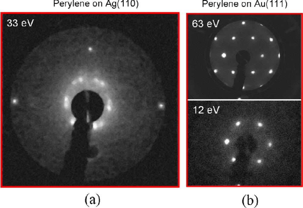 Molecules were deposited onto metal surfaces from the gas phase in ultra-high vacuum (UHV), which is referred to as organic molecular beam deposition (OMBD) or organic molecular beam epitaxy (OMBE), and is an ideal means to achieve a high-level control over the molecular deposition with extremely high chemical purity and structural precision. In our experiments, molecules were deposited with a MBE-LEED apparatus, which integrates molecular beam epitaxy with low energy electron diffraction and allows in situ recording of diffraction patterns in real time during molecular deposition. For the deposition of PAHs on metals, the LEED pattern appears like a halo at dilute coverage, changes into a diffuse ring with the coverage increasing, then decays into diffuse spots with the coverage close to one monolayer, and finally shows sharp diffraction spots at monolayer coverage. Figure 1(a), (b) are the LEED patterns of perylene monolayer on Ag(110) and on Au(111), respectively [6–8].