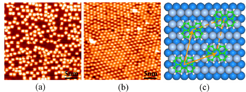 Molecules are important building blocks for bottom-up fabrication of functional nanostructures in nanotechnology [1–3]. Integrating device functions onto single molecules will be an ideal solution for the device miniaturization pushed by the Moore’s Law. Most molecules can self-assemble into ordered nanostructures on surfaces, which can be precisely controlled through modifying the properties of molecules or surfaces [4–15]. Molecular self-assembly can produce high-quality functional organic thin films and well-ordered organic/metal interfaces, and in the meanwhile, is a feasible scheme for fabricating complex nanoscale circuits. The most important advantage of molecules lies in the fact that the well-developed molecular synthesis techniques can produce various molecular structures, which offers a high controllability over single molecular properties and molecular nanostructures. In particular, molecular self-assembly and single molecular machines are two of the most crucial issues in molecule-based nanotechnology. Polycyclic aromatic hydrocarbons (PAHs) and metal phthalocyanines (Pcs) are among the most promising candidates for molecular-based nanotechnology.