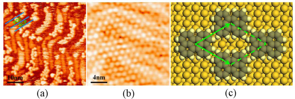 (a) STM image (50 nm × 50 nm, U = −1.3 V, I = 0.05 nA) of 0.3 ML perylene molecules on the reconstructed Au(111) surface. (b) STM image (20 nm × 20 nm, U = −0.7 V, I = 0.03 nA) of perylene monolayer. (c) Supposed structural model for perylene monolayer on Au(111) surface. Bridge site is selected according to our DFT calculations.