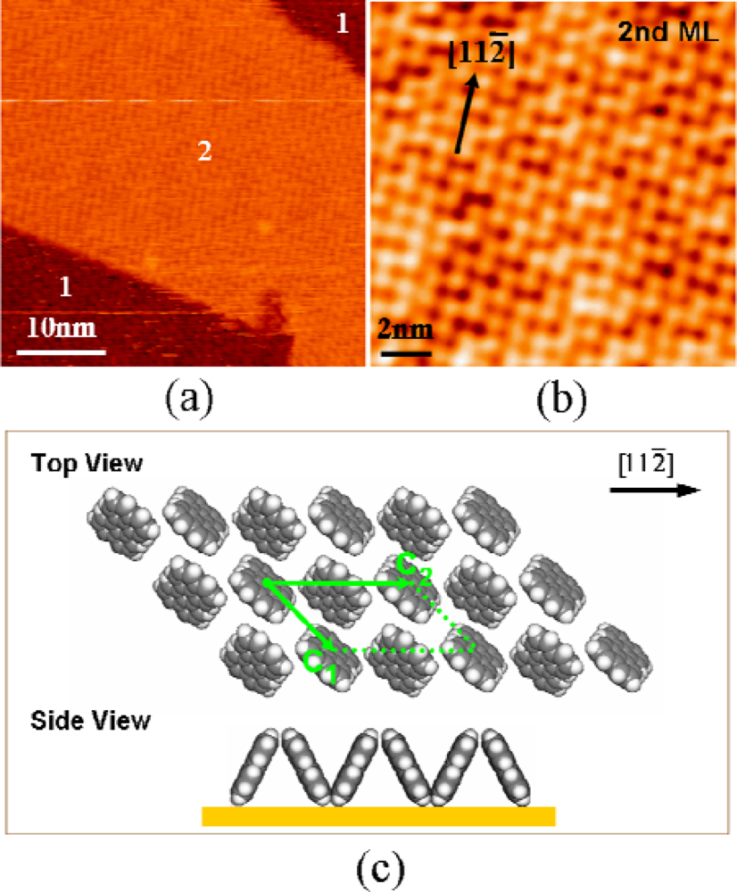 2] direction. The structure of the second layer can be determined. Molecules form an oblique two-dimensional Bravais lattice with two molecules at each Bravais lattice point. We determine that the molecules in the second layer adopt a tilted configuration, instead of a flat-lying configuration, according to the measured height of the islands and the molecular density derived from the STM measurements. Figure 4(c) illustrates the supposed structural model of the second layer.