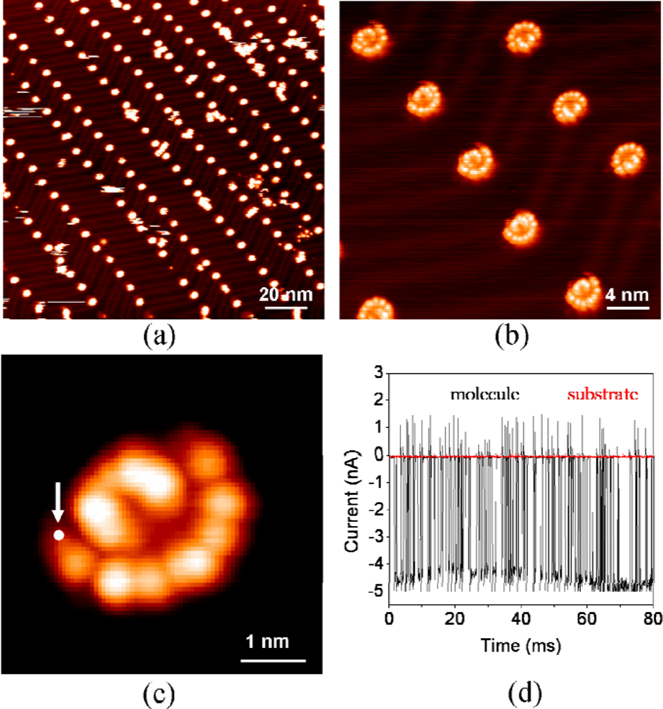 (a) STM image of large scale ordered array of single (t-Bu)4-ZnPc molecular rotors on the reconstructed Au(111) surface. (b) High-resolution STM image of single molecular rotors showing a “folding-fan” feature. The molecular rotors at two different elbow sites show different features due to the modulation by corrugation ridges. (U = −1.3 V, I = 0.07 nA). Images were taken at 78 K. (c) A close-up high-resolution STM image of single molecular rotor showing a “folding-fan” feature. (U = −2 V, I = 0.05 nA). (d) Tunneling current versus time measured on the molecular rotor. The arrow and spot in (c) indicate the position where the I-t spectroscopy was measured.