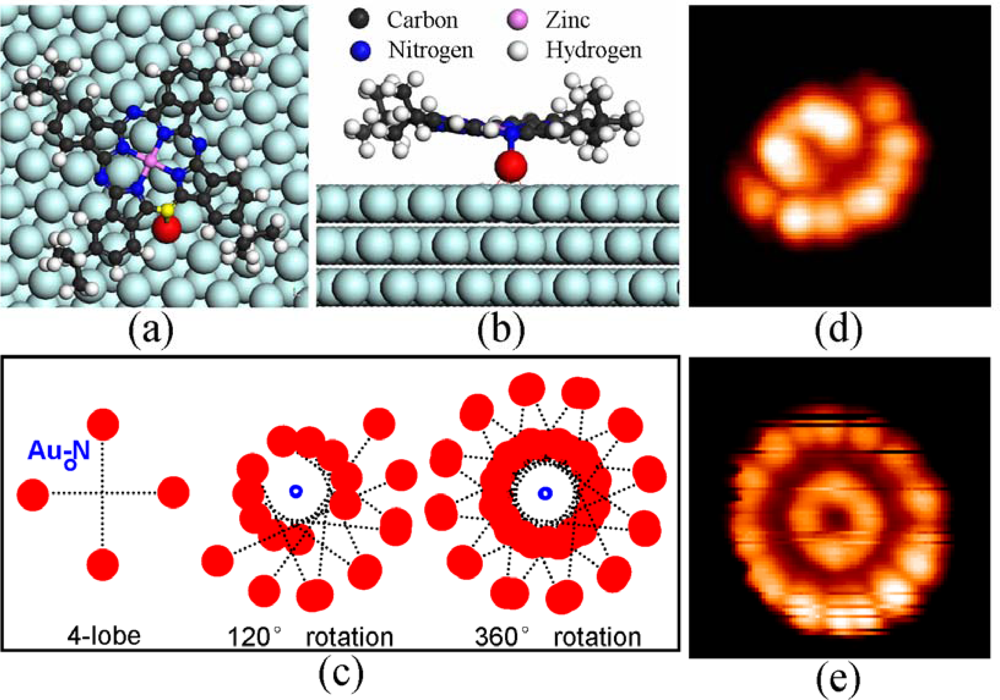 Figure 6(a,b) is the top and side view of the optimized configuration for a single (t-Bu)4-ZnPc molecule adsorbed on a gold adatom. Here, our calculations show that the distance between the zinc atom and its nearest neighboring gold atom is 4.60 Å, the distance between the bottom nitrogen [colored in yellow in Figure 6(a)] and the gold atom is 2.25 Å; the adsorption energy of this configuration in this case is 804 meV. In contrast, the calculation results [43] for a single (t-Bu)4-ZnPc molecule adsorbed directly on Au(111) show that the distance between the zinc atom and its nearest-neighbor gold atom is 4.35 Å, the distance between the bottom nitrogen atom and its nearest-neighbor gold atom 4.40 Å; the adsorption energy of this configuration is 219 meV. Obviously, the gold adatom enhances the molecular bonding significantly, which is most likely due to the surface dipole originating from smeared out electron charge at the position of the adatom [59]. The strong chemical bond between nitrogen and the gold adatom prevents lateral molecular diffusion along the surface, and in particular offers a fixed off-center axis for the rotation of single (t-Bu)4-ZnPc molecules at 78 K.