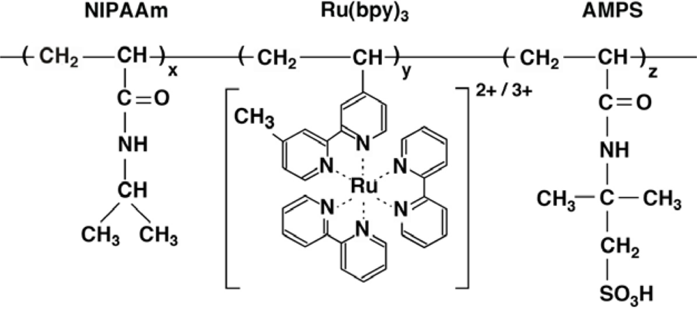 Chemical structure of poly(NIPAAm-co-Ru(bpy)3-co-AMPS).