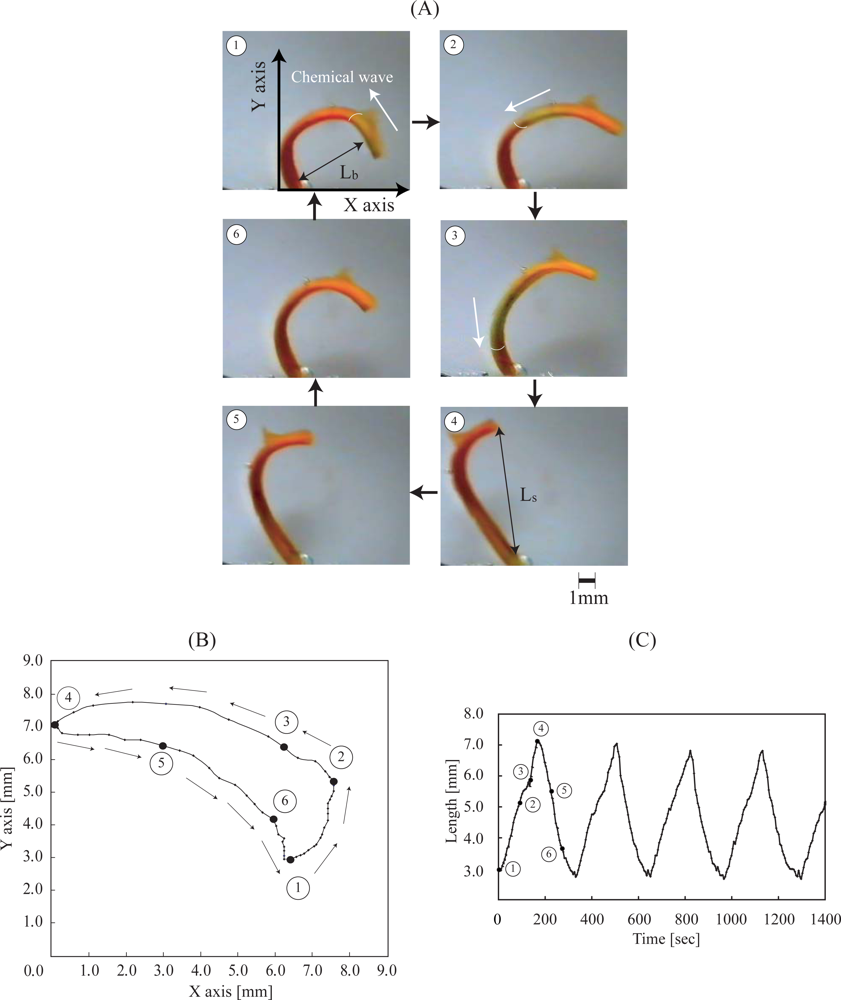 The gel membrane (length 9.0 mm, width 2.0 mm) was immersed in 8 mL of an aqueous solution containing malonic acid ([MA] = 0.0625 M), sodium bromate ([NaBrO3] = 0.084 M), and nitric acid ([HNO3] = 0.894 M). One end of the gel strip was sandwiched in the incision of the silicone rubber. The bending and stretching oscillations for the gel strip were measured under constant temperature. Shape changes of the gel strip were observed and recorded using a microscope (Fortissimo Corp., WAT-250D), LED light (LEDR-74/40W), and a video recorder (Wooju, Time Lapse Recorder).