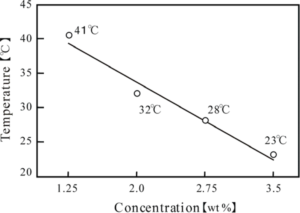 The lower critical solution temperature (LCST) of the self-oscillating polymer solution was measured under the reduced and oxidized states by utilizing Ce(SO4)2 as an oxidizing agent and Ce2(SO4)3 as a reducing agent, respectively. The polymer solutions were prepared by dissolving the polymer chain in an aqueous solution, respectively. LCST measurements were carried out with a spectrophotometer (Shimadzu, Model UV-2,500) equipped with a thermostatic controller and magnetic stirrers. The transmittance (%) of the polymer solution at 570 nm was then recorded by raising the temperature at a rate of 0.5 °C/min.