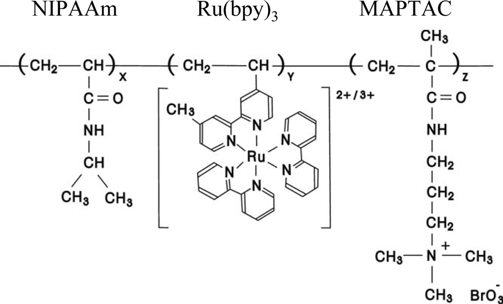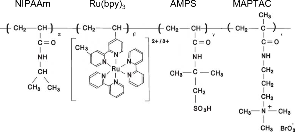 Chemical structure of poly(NIPAAm-co-Ru(bpy)3-co-AMPS-co-MAPTAC).