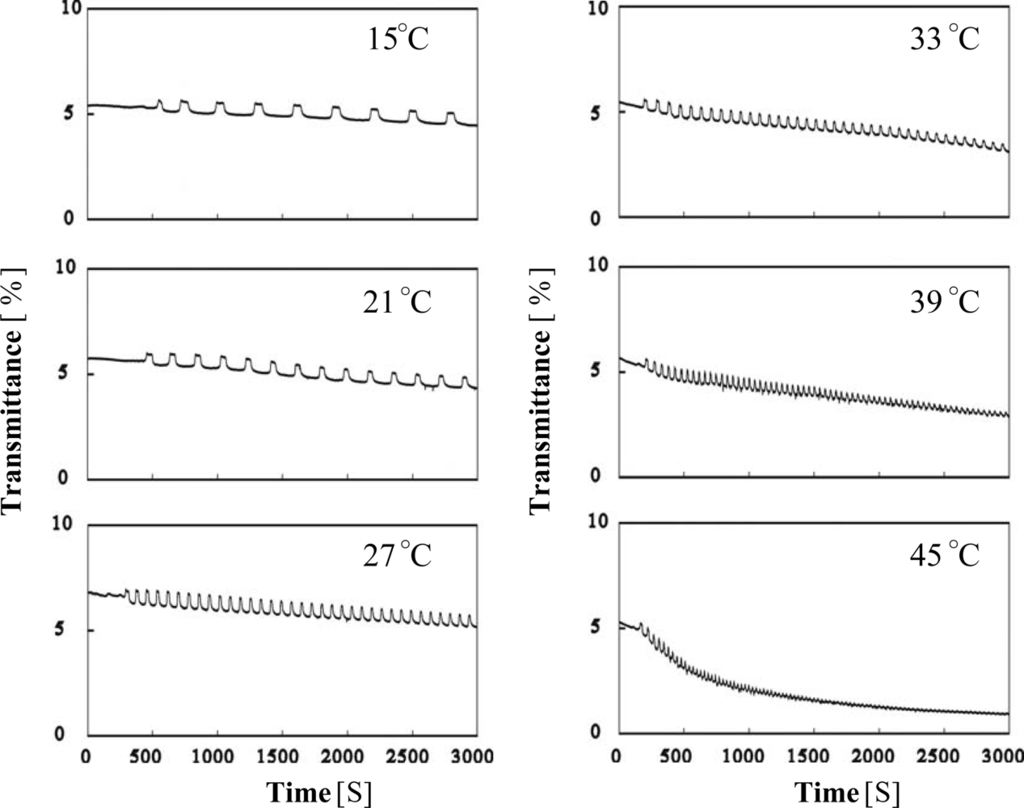 Oscillating profiles of the optical transmittance for poly(NIPAAm-co-Ru(bpy)3-co-MAPTAC) solutions at several constant temperatures (reprinted from ref. [14] with permission; © The American Chemical Society).