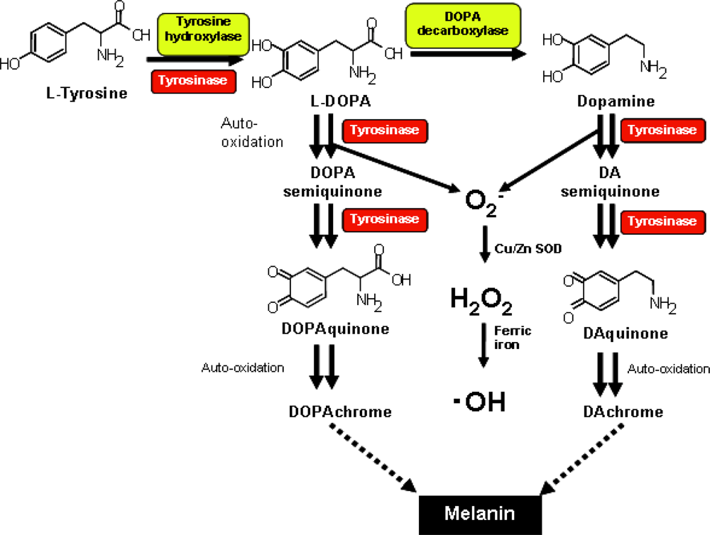 Tyrosinase (EC 1.14.18.1; monophenol monooxygenase), a copper-containing metalloprotein, is a key enzyme in the biosynthesis of melanins and other polyphenolic compounds []. Tyrosinase catalyzes both the hydroxylation of tyrosine to l-DOPA and the subsequent oxidation of l-DOPA to dopaquinone (Figure 1) [,]. In addition, under certain circumstances tyrosinase may oxidize DA to form melanin pigments, probably through DA quinone [,]. Therefore, tyrosinase is the major enzyme required for the synthesis of melanin in skin and hair and may contribute to neuromelanin formation. In mammals, tyrosinase is specifically expressed in differentiated melanin-producing cells such as melanocytes that are distributed in the skin and retinal pigment epithelium []. In the mammalian central nervous system, a DA-derived pigment, neuromelanin, is found in nigral dopaminergic cells []. The existence of tyrosinase in the central nervous system is still controversial, although several studies have shown the expression of tyrosinase gene, its protein, and its catalytic activity in the nigral neurons [,–]. Greggio et al has shown that tyrosinase activity is higher in substantia nigra, a region rich in DA, the major tyrosinase substrate.