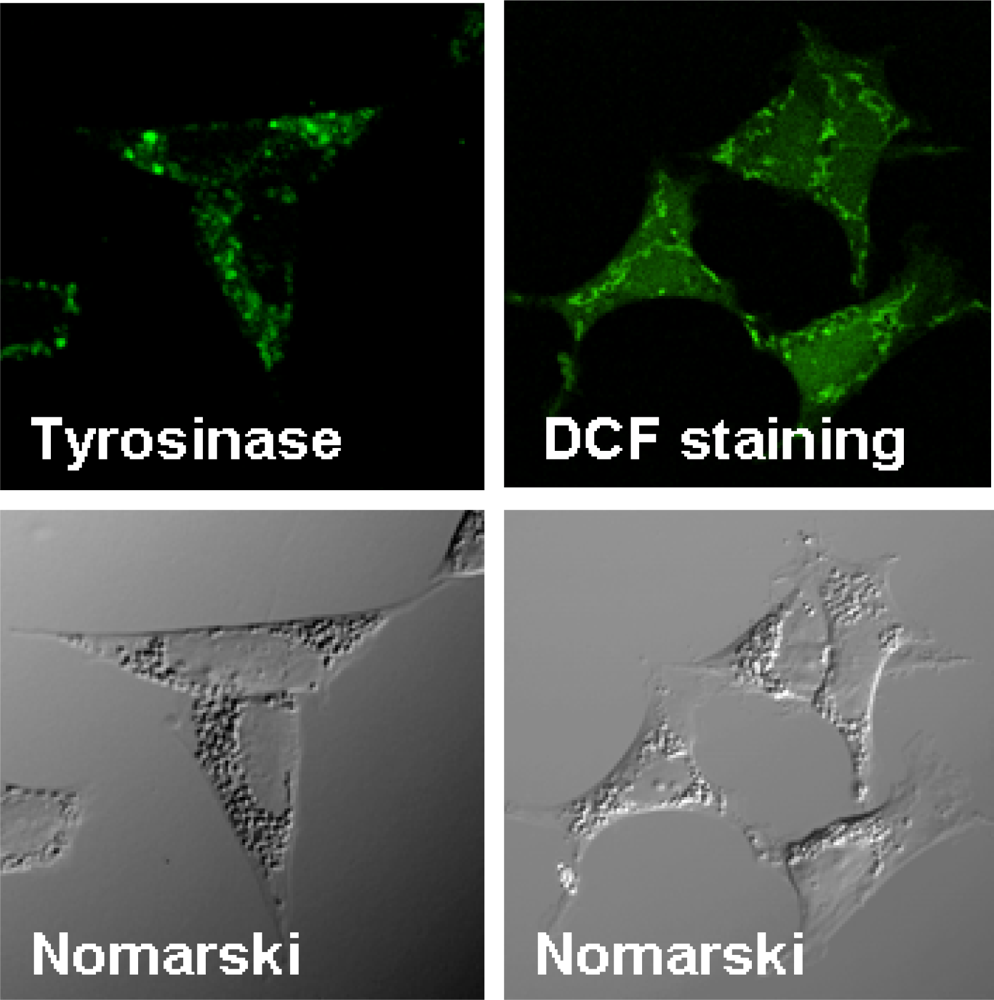 Inducible expression of human tyrosinase in SH-SY5Y cell. Immunohistochemical staining of SH-SY5Y cell line expressing tyrosinase under tetracycline regulatable promoter. At 72 hrs after the induction with doxycycline (1 g/mL), dispersed cytoplasmic tyrosinase protein (green) had accumulated in cytoplasmic particles, which were co-localized with rounded, pigmented bodies mimicking the neuromelanin granules. Intracellular ROS production was visualized by ROS indicator DCFH2DA (green fluorescence).