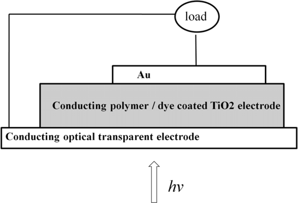 One of the first solid state dye sensitized heterojunctions between TiO2 and conducting polymer was reported by Murakoshi and coworkers []. The prototype of this kind of solid state DSSC is shown in Figure 1.