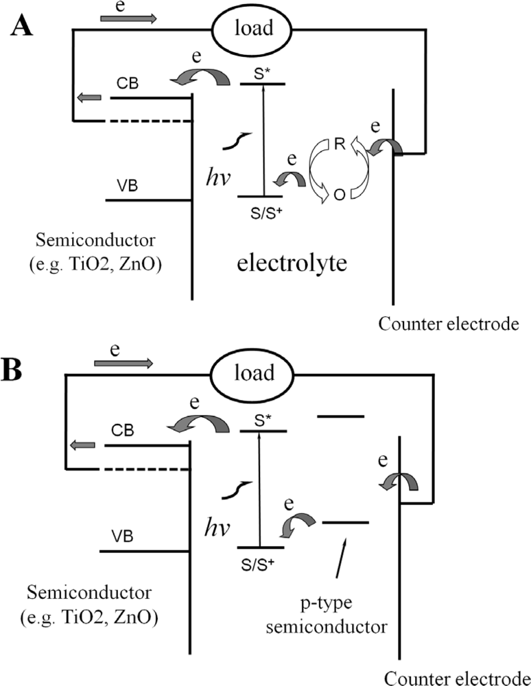 Operation mechanism of the dye sensitized electrochemical solar cell (DSSC). S: Dye sensitizer, S*: Electronically excited dye sensitizer, S+: oxidized dye sensitizer O/R: redox couple (e,g, I3−/I−). CB: Conduction band for semiconductors, VB: valence band for semiconductors. (A) Wet-type DSSC with redox couple in the liquid electrolyte. (B) Solid state DSSC with a p-type semiconductor to replace the electrolyte containing the redox couple.