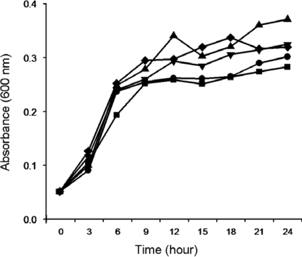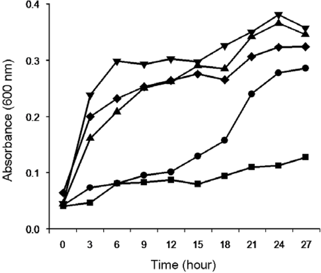 The effect of different pH values on EMS growth indicated by absorbance at 600 nm measured every 3 hours. EMS was incubated with M9 medium containing crude MCs extract with pH values at 5.0 (▪), 6.0 (•), 7.0 (▴), 8.0 (▾), and 9.0 (♦), respectively.