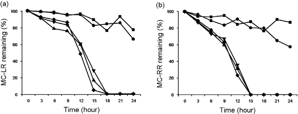 The effect of different incubation pH values on the degradation of MC-LR (a) and MC-RR (b) by strain EMS. EMS was incubated with M9 medium containing crude MCs extract with pH values pH values at 5.0 (▪), 6.0 (•), 7.0 (▴), 8.0 (▾), and 9.0 (♦), respectively. The incubation temperature was 30 °C. Initial concentration of MC-LR and MC-RR in medium was 1.53 μg/mL and 0.82 μg/mL, respectively.