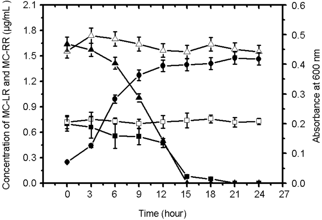 Degradation of MC-LR and MC-RR by strain EMS. Strain EMS growth in M9 medium containing crude MCs extract was detected by measuring the absorbance of the culture at 600 nm (•). Concentrations of MC-LR (▪) and MC-RR (▴) were measured every 3 hours. ( ) and (□) indicate the concentrations of MC-LR and MC-RR in medium without bacteria, respectively. Vertical bars represent standard deviation of the mean (n = 3).