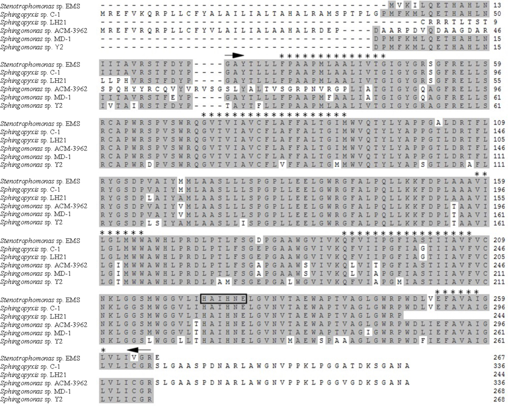 The putative protein named as MlrA-EMS translated from mlrA-EMS gene was constituted by 267 amino acids. The multialignment of MlrA-EMS with five other MlrA sequences was performed by MegAlign in DNAStar (DNASTAR, Inc., Wisconsin, USA). MlrA-EMS showed high amino acid sequence similarities with other MlrAs. A highly conserved region was located between G26 to R266 in MlrA-EMS (Figure 9). ProtParam analysis suggested that MlrA-EMS might be a hydrophobic protein. Five alpha helixes (indicated as * in Figure 9) that were considered to be transmembrane regions were found in MlrA as well.