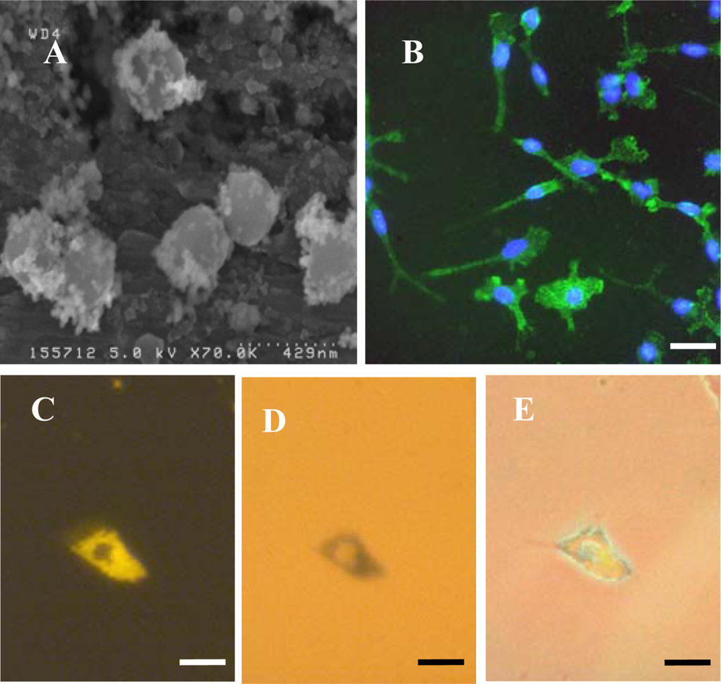 MNP uptake by microglial cultures: particle and culture characterization. (A) SEM image of Spherofluor MNPs demonstrating uniformity of size of particles. (B) Double-merged image of microglia immunostained with OX-42 antibody (green) and mounted with medium containing the nuclear marker, DAPI (blue) demonstrating high culture purity. (C) Nile Red fluorescence associated with MNPs in microglial cell at 24 h after labelling with 20 μg/mL MNPs for 1 h. (D) Light micrograph of cell depicted in (C) showing blue deposits of iron-containing material detected by Perl’s staining. (E) Merge of images C & D demonstrating co-localization of iron and Nile Red fluorescence, reflecting the stability of MNPs in microglia. Scale bar in (B) = 50 μm and in (C–E) = 25 μm.