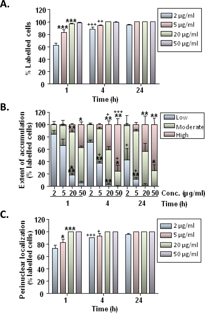 Time course and concentration-dependence of MNP uptake in microglia. (A) Bar chart showing the proportion of OX-42-positive cells showing MNP uptake. (B) Stacked bar chart showing the extent of particle accumulation by cells. (C) Bar chart showing proportion of labelled cells with a perinuclear particle localization (either exclusively or combined with a cytoplasmic distribution). *P < 0.05, **P < 0.01 and ***P < 0.001 versus preceding MNP particle concentration at the same time point; +P < 0.05, ++P < 0.01 and +++P < 0.001 versus same concentration at preceding time point (two-way ANOVA and Bonferroni’s post-tests; n = 3 cultures).