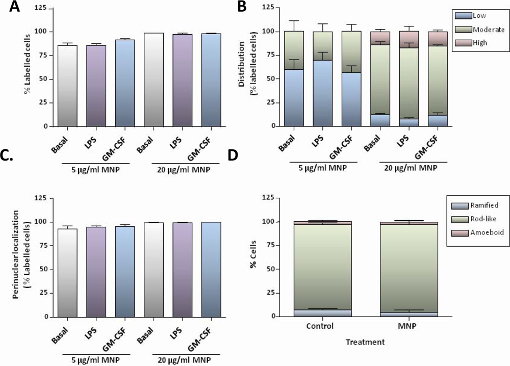 In the absence of exogenous stimulators, the majority of OX-42 positive cells exhibited an elongated or rod-like appearance. Treatment of cultures with 100 ng/mL LPS for 24 h resulted in a marked increase in the proportion of OX-42 positive cells with rounded or amoeboid morphologies, consistent with activation. Marked changes in cell morphology were not observed in cultures pre-treated with 25 ng/mL GM-CSF for 24 h. The uptake of MNPs by microglia was not affected by pre-treatment of cultures with LPS or GM-CSF, as judged from the proportion of labelled OX-42 positive cells (Figure 4A), the extent of particle accumulation (Figure 4B) and the proportion of labelled cells displaying particles with a perinuclear localization (Figure 4C). Additionally, incubation of cells in basal medium with 20 μg/mL MNPs for 24 h had no effect on microglial morphology (Figure 4D).