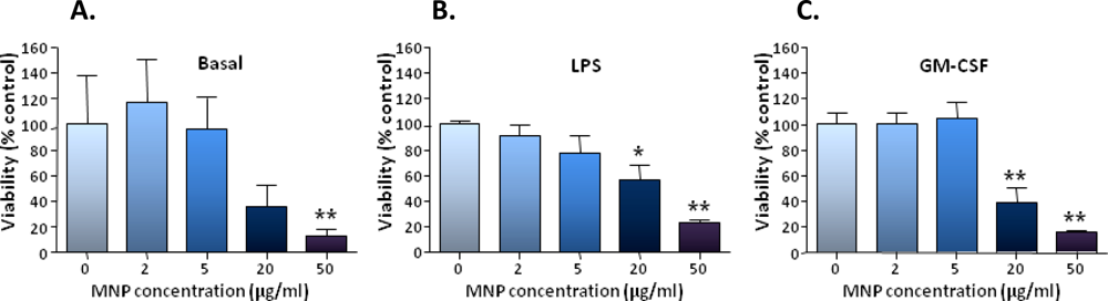 The effect of particle exposure for 24 h on cell viability was determined at 3 days post-particle incubation using a MTS assay. In the absence of an exogenous stimulator, cultures which had been pre-incubated with 50 μg/mL MNPs showed a clear-cut decrease in cell viability (mean value was 13% control value); a similar (though not statistically significant) trend was observed for cultures pre-incubated with 20 μg/mL MNPs (36% control value; Figure 5A). For cultures which had been treated with either GM-CSF or LPS, clear-cut decreases in cell viability were observed for both 20 and 50 μg/mL MNP concentrations; respective values were: 56% and 23% control values for cultures treated with LPS (Figure 5B); and 39% and 16% control values for cultures treated with GM-CSF (Figure 5C).