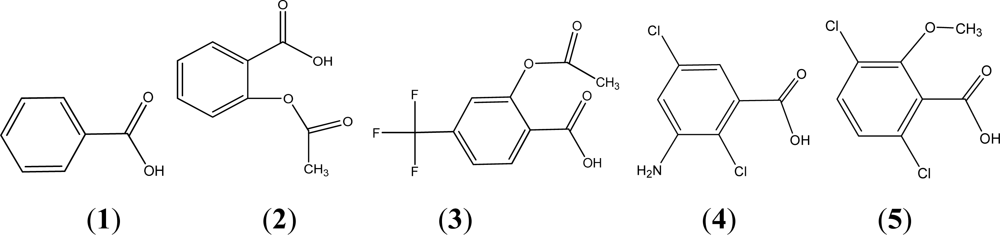 Molecular structures of benzoic acid (1), aspirin (2), triflusal (3), chloramben (4) and dicamba (5).