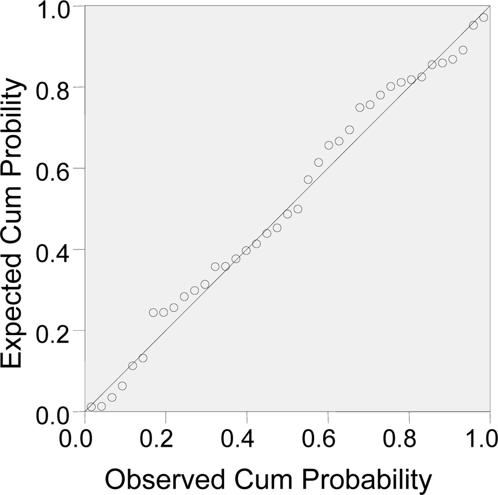 Obeying the principles that the value of correlation coefficient (R2) is approximate to 1 and the p value is less than 0.01, as well as the numbers of the parameters equal to the test coefficient, we found that the linearity of the model is appropriate. The result of residual analysis shows that the fitting of the model was good (see Table 2). The distribution of residual is a normal distribution, since the scatter plots are almost standing on one line (see Figure 2).
