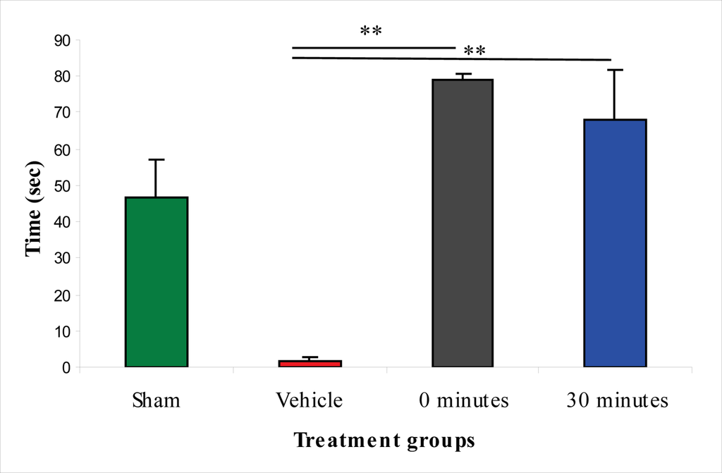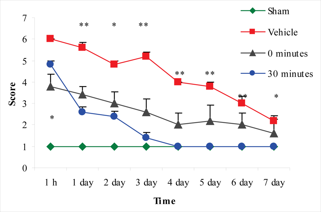 In the assessment of the beam-balance test, sham-injured animals did not display any motor impairment. The vehicle-treated group had the worst motor performance of the four groups assessed. Both treatment paradigms improved the beam-balance performance. Immediate post-injury treatment significantly improved the motor performance at one hour. However, a statistically significant difference was not observed after this time-point in comparison to vehicle-treated rats; rats in this treatment group did not reach the maximal accessible score (1) during the seven-day period. The group treated 30 min post-injury reached the maximal accessible score on the fourth day. The motor performance of this group was significantly improved from the second examined time-point (one hour) up to the last time-point (seventh day) compared to the vehicle-treated group (Figure 6).