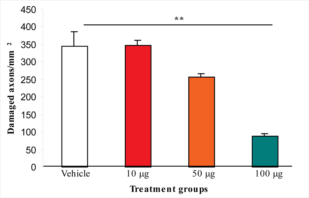 The effect of i.c.v. L-2286 administered in different doses 30 min after severe impact acceleration head injury on the density of APP immunopositive axons in the CSpT (** p < 0.01 compared to vehicle group).