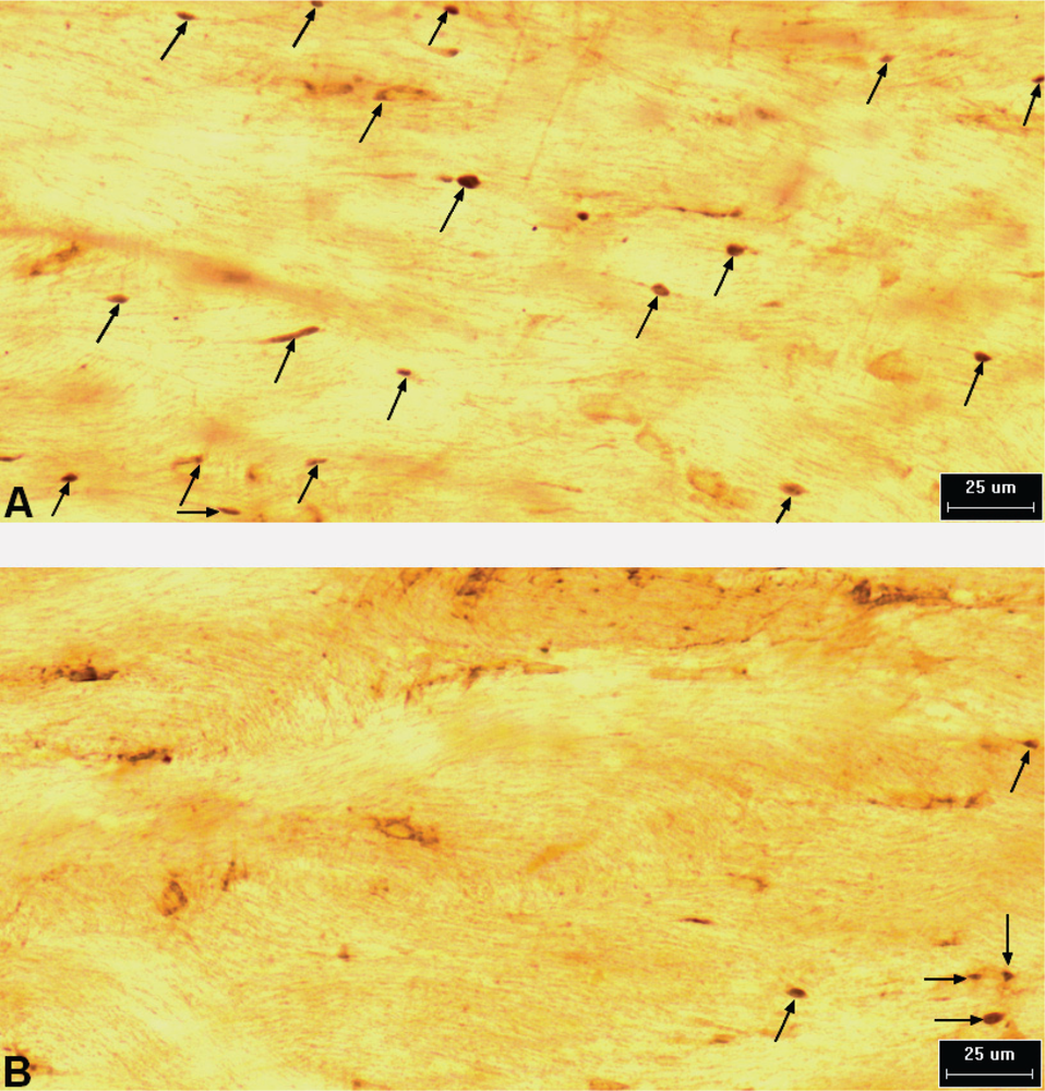 APP-IR axonal profiles (arrows) from CspT two hours post-injury. Note that the density of damaged axons appears reduced in rats treated with 100 μg/rat of i.c.v. L-2286 (B) compared to those treated with vehicle (A).