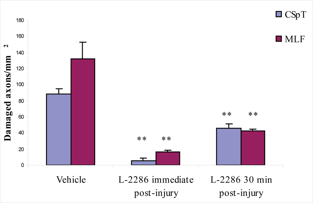 Densities of RMO-14 immunopositive axons in CSpT and MLF in animals treated with 5 μl/rat of i.c.v. vehicle and 100 μg/rat of i.c.v. L-2286 immediately and 30 min post-injury (**p < 0.01 compared to vehicle).